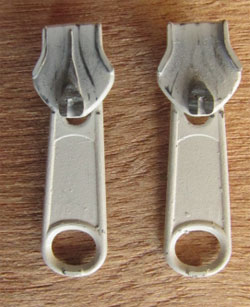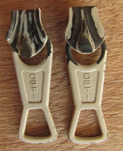 Het meest voorkomende probleem bij kapotte ritsen is dat de schuiver versleten is waardoor de rits niet meer mooi dichtgaat of na het sluiten weer opensplijt. Door het gebruik zijn er in de schuiver groeven ontstaan (foto links). Hierdoor kunnen de tanden van de rits niet meer goed in elkaar schuiven. Dit is simpel op te lossen door de schuiver te vervangen voor een nieuwe (foto rechts).