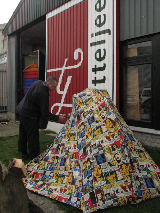 Bijvoorbeeld deze uit gordijnstof gemaakte waterdichte striptent.