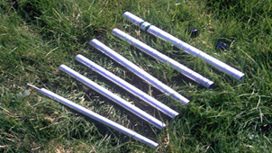 Mostert telescoopstokken. is de beste keuzen voor compact kamperen. Op de onderste 2 foto's staat een telescoopstok, in delen en in elkaar geschoven. Op deze manier nemen de tentstokken weinig plaats in tijdens het vervoer.